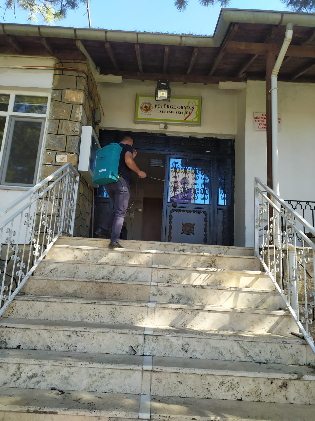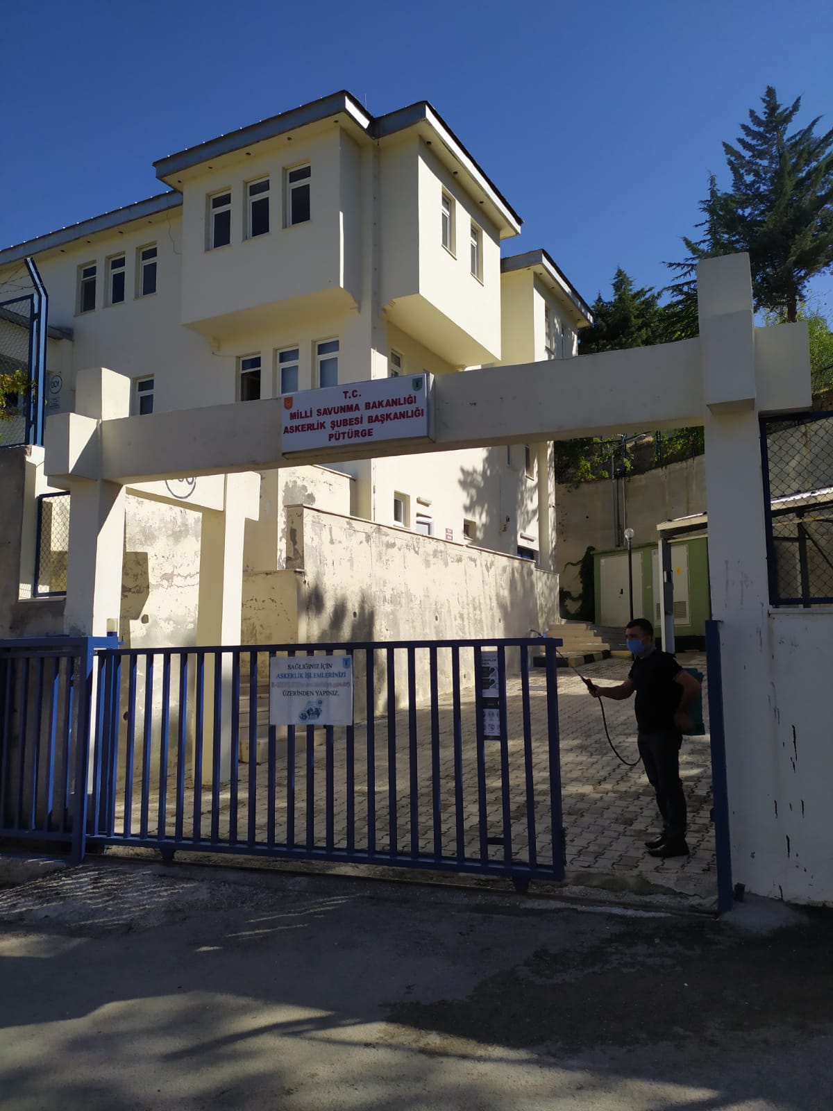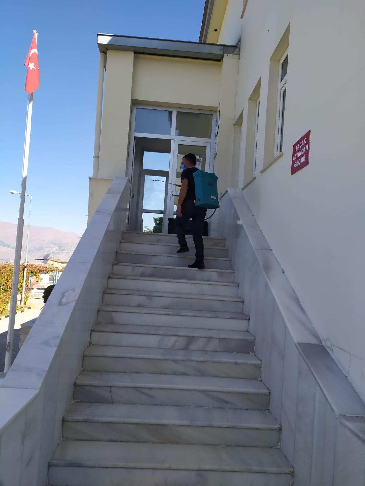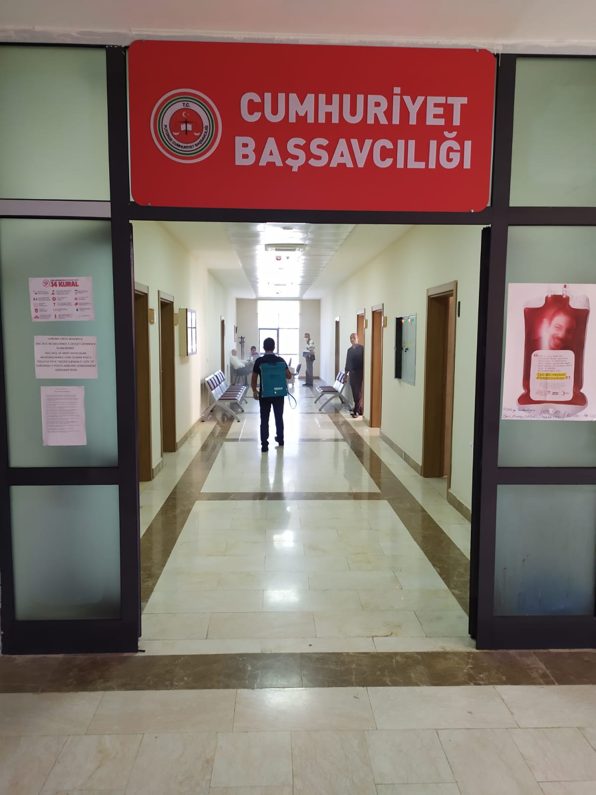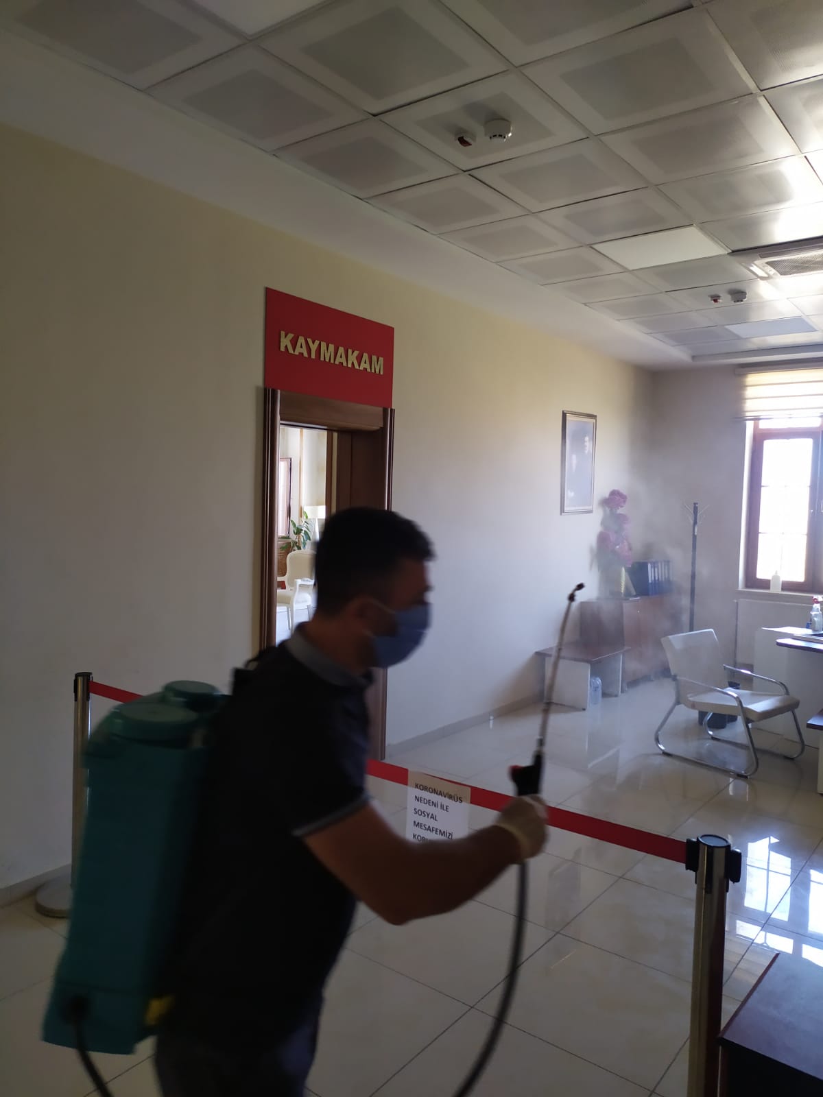 Koronavirüs ile mücadele tedbirleri kapsamında ekiplerimizce ilçemizdeki Devlet dairelerini ilaçlama ve dezenfekte çalışmalarımız periyodik olarak devam ediyor