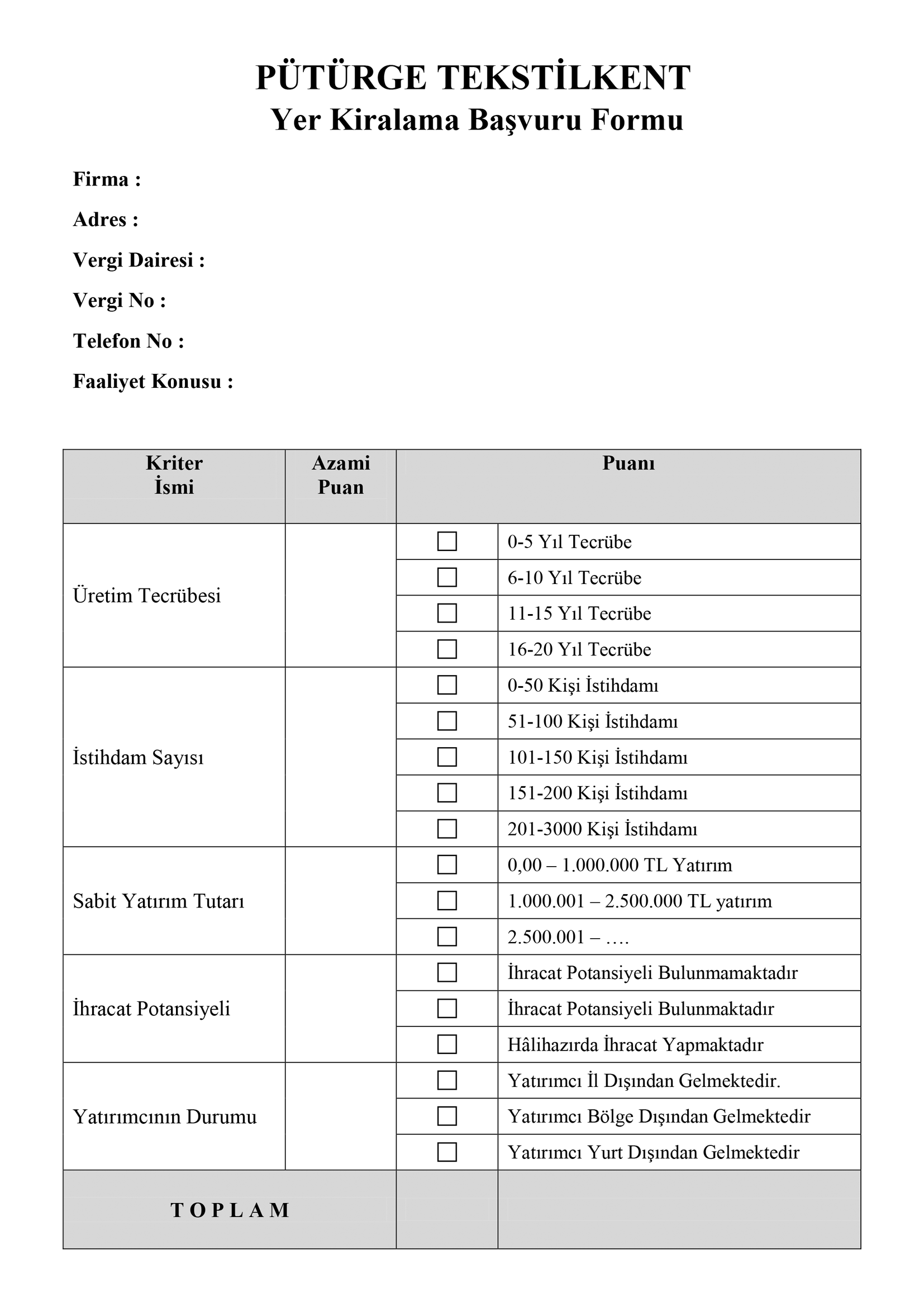 Pütürge Tekstilkent Yer Kiralama Başvuru Formu
